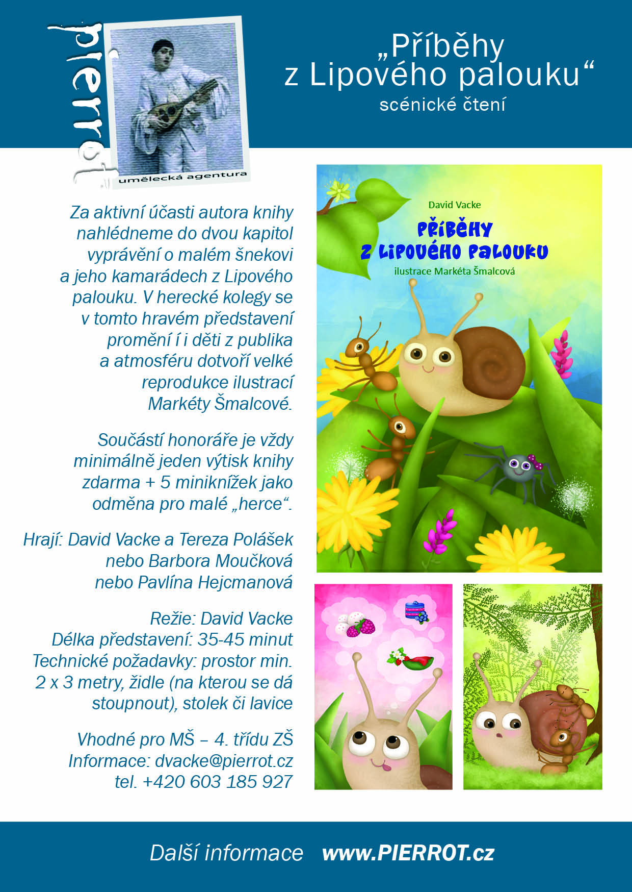 Za aktivní účasti autora knihy nahlédneme do dvou kapitol vyprávění o malém šnekovi a jeho kamarádech z Lipového palouku. V herecké kolegy se v tomto hravém představení promění í i děti z publika a atmosféru dotvoří velké reprodukce ilustrací Markéty Šmalcové. Součástí honoráře je vždy minimálně jeden výtisk knihy zdarma + 5 miniknížek jako odměna pro malé „herce“.